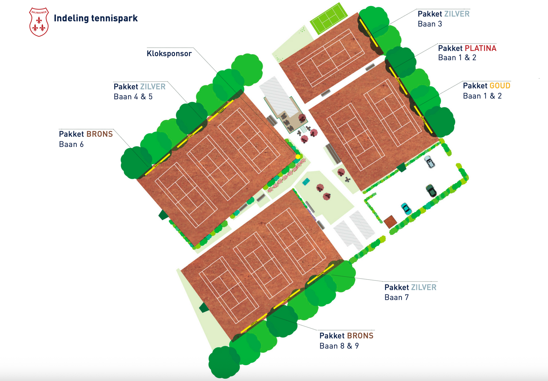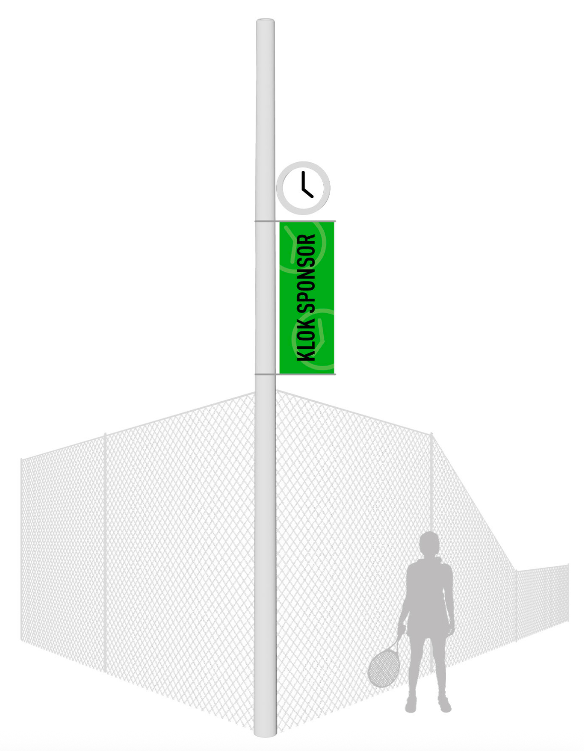 - Bedrijfsnaam onder de Klok: Vermelding van uw bedrijfsnaam centraal op het tennispark gesitueerd, onder de Klok. Tennissers kijken veelal op deze klok om te zien of hun speeltijd om is;